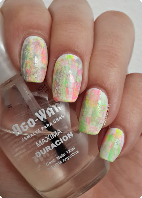 Para esta mani use de base el blanco de Ago Wan que lo súper recomiendo, y para hacer las "pinceladas" use Esperanza -verde-, Copo de Nieve -gris-, Alegría -amarillo- y Felicidad -rosa- todos de la marca Dulce Diallo.